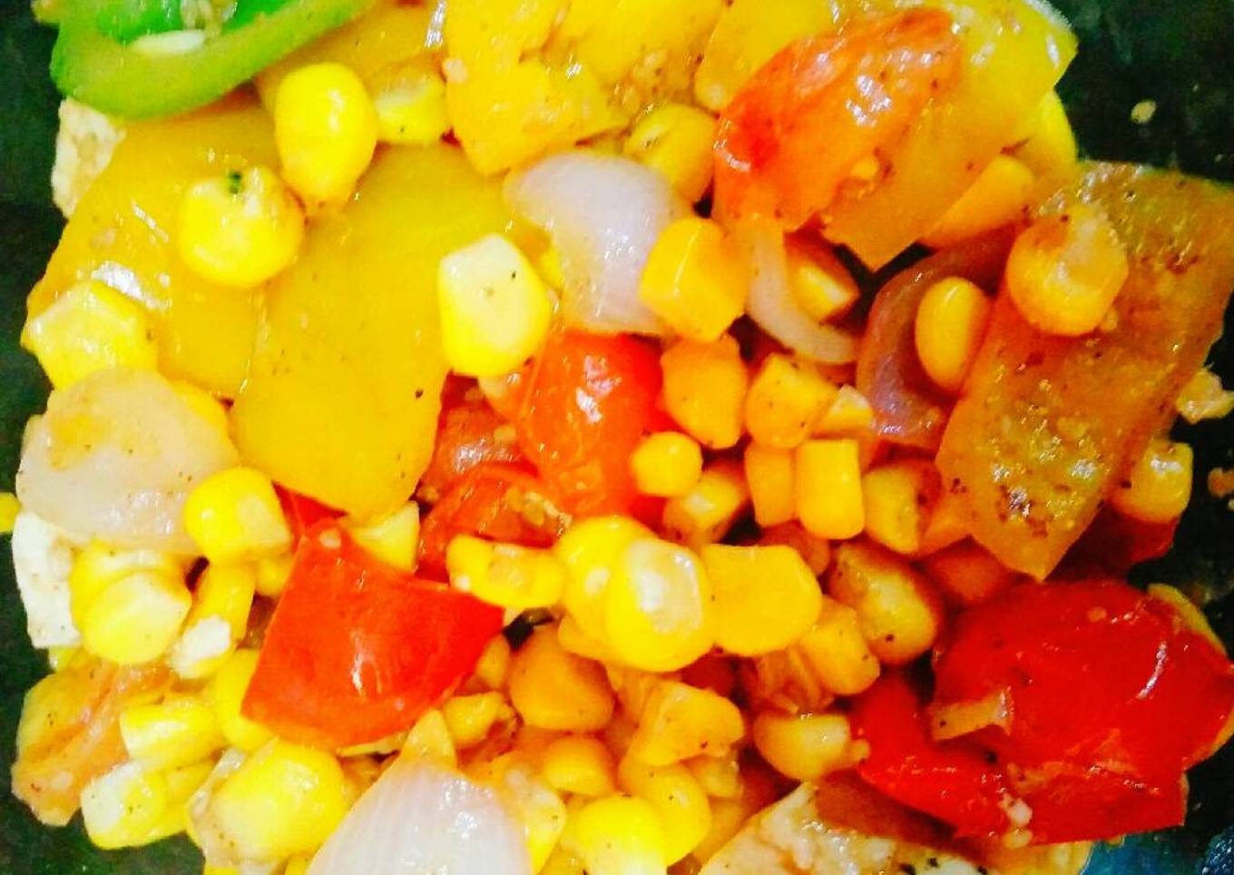 - Now add boiled corn, tomato, paneer cubes, salt and pepper powder and mix well and again cook for about 2-3 min.