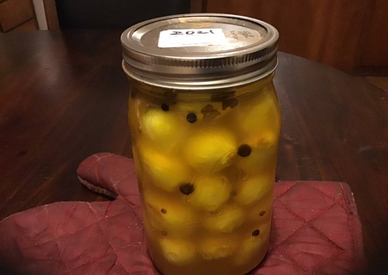 - Boil vinegar, sugar, spices. Pour slowly over onions. Put open jar in deep pan, fill pan with warm water till the neck of the jar, boil 15 minutes. Cap jar with lid and screwcap, lift out, put upside down on towel to cool. Check if lid is firm on jar when cool. If firm, put in pantry, mark year on top. If not, put in fridge and eat. Done.
