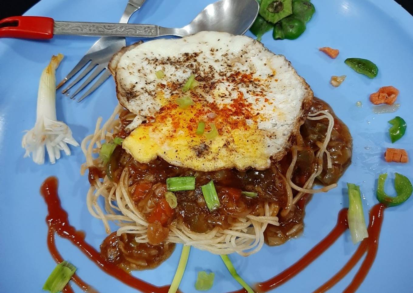 - Now put fried noodles in a plate and then prepare veg sauce and serve it by placing egg