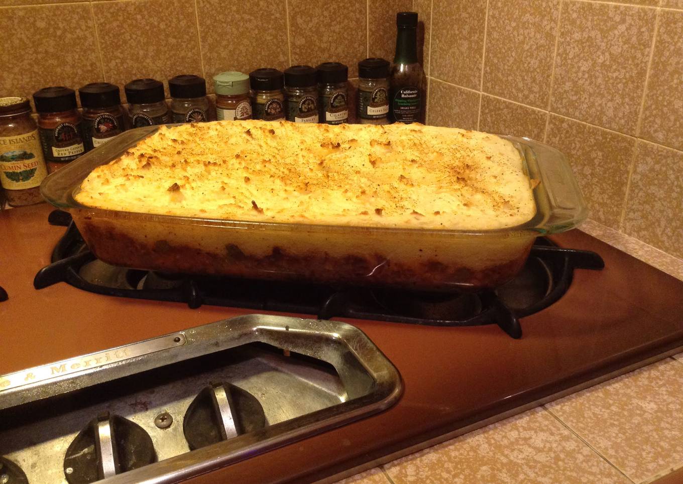 - Combine in lightly greased 3 qt casserole dish: Beef filling on bottom. Sprinkle layer of cheese on top. Top with mashed potatoes. (Make sure the potatoes seal the beef filling in so it doesn't boil and create a mess.) Use a fork to make rivets on the top of the mashed potatoes. Add small amount of paprika on top.