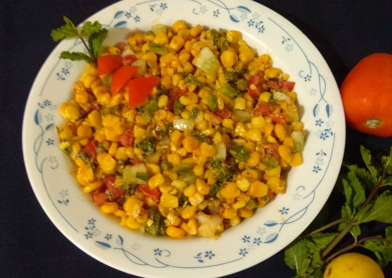 - Add boiled American corn kernels, chopped tomato, cucumber, capsicum, coriander and mint leaves. Toss well.